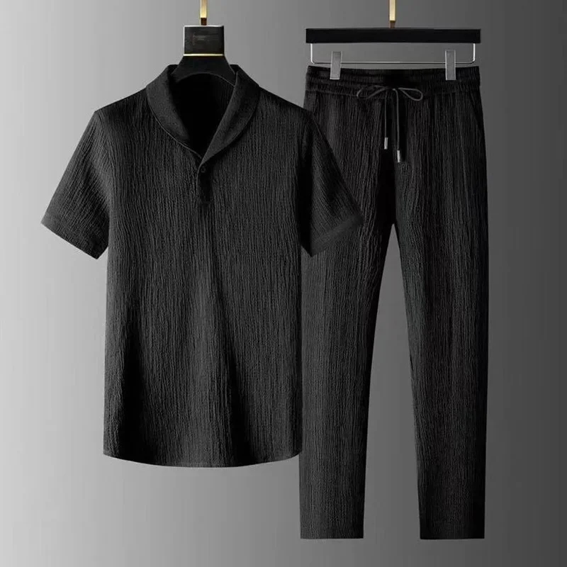 طقم مصنوع من خامة الحرير الجليدي الناعمة والخفيفة، يتميّز بأنه سريع الجفاف وجيد التهوية، يخليك مرتاح حتى مع حرارة الصيف.